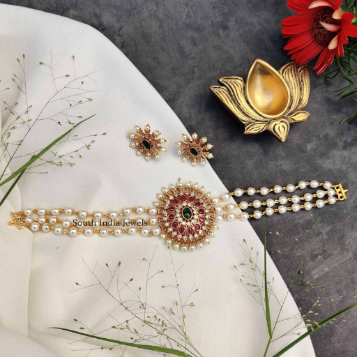 Gorgeous three layered pearl choker with matching earrings and studded with multi color stones. Most adorable fine jewelry made by the best artisans. Also shop more Layered Pearl Choker at south India jewels.